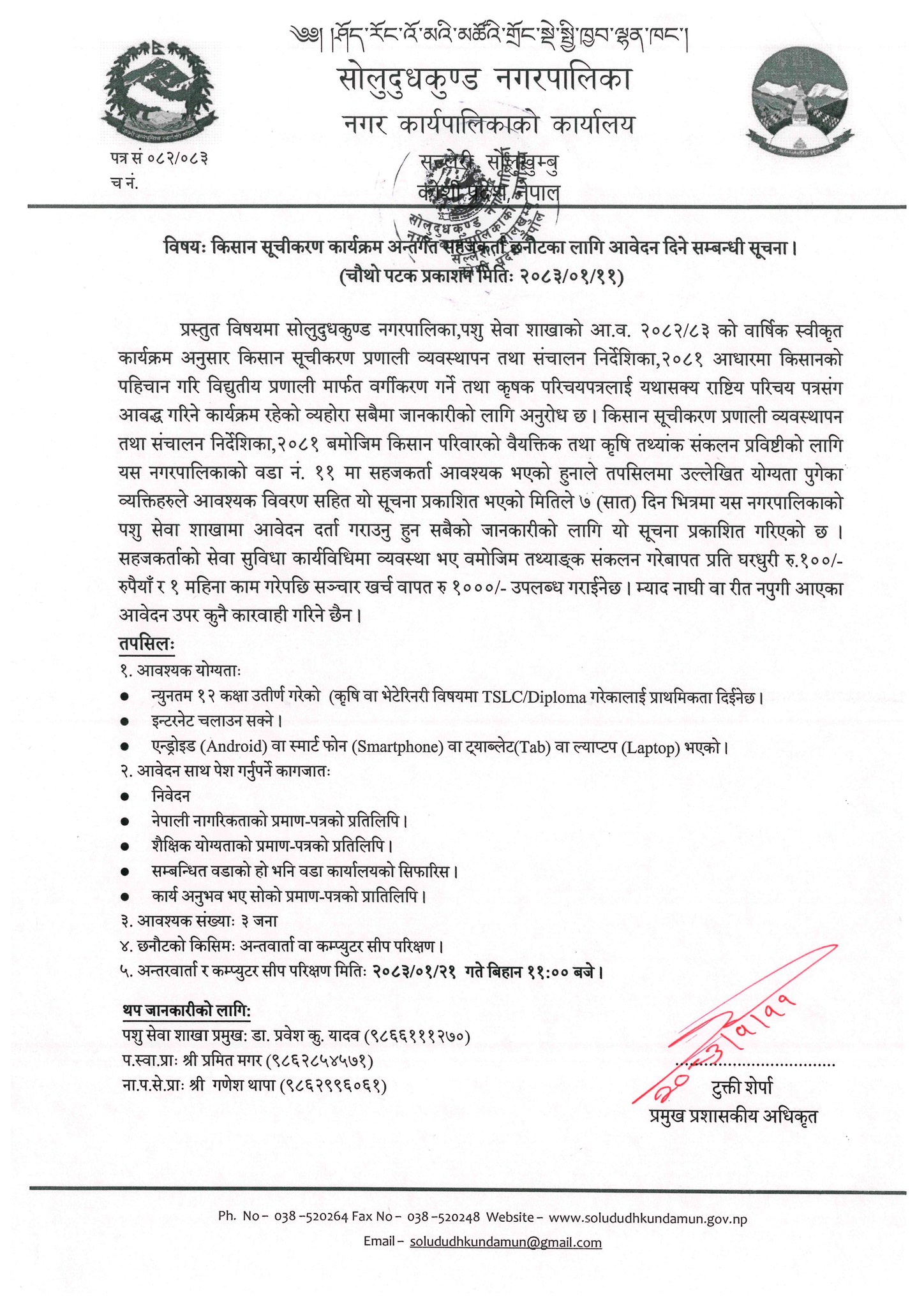 » किसान सूचीकरण कार्यक्रम अन्तर्गत सहजकर्ता छनौटका लागि आवेदन दिने सम्बन्धी सूचना ।
