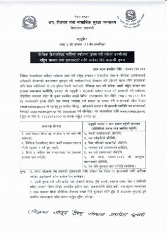 वैदेशिक रोजगारीबाट फर्किएर स्वदेशमा उद्यम गरी बसेका उद्यमीलाई राष्ट्रिय सम्मान तथा पुरस्कारको लागि आवेदन दिने सम्बन्धी सूचना ।
