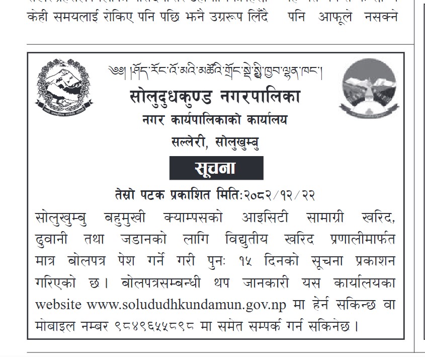 » सोलुखुम्बु बहुमुखी क्याम्पस (ICT–ई-लाइब्रेरी) का लागि ICT सामग्री आपूर्ति, ढुवानी तथा जडान कार्यका लागि बोलपत्र आह्वान