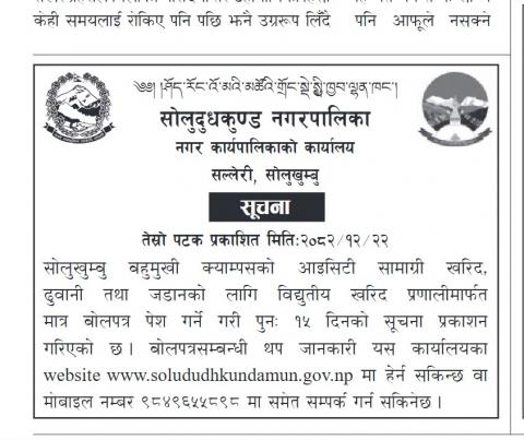 सोलुखुम्बु बहुमुखी क्याम्पस (ICT–ई-लाइब्रेरी) का लागि ICT सामग्री आपूर्ति, ढुवानी तथा जडान कार्यका लागि बोलपत्र आह्वान